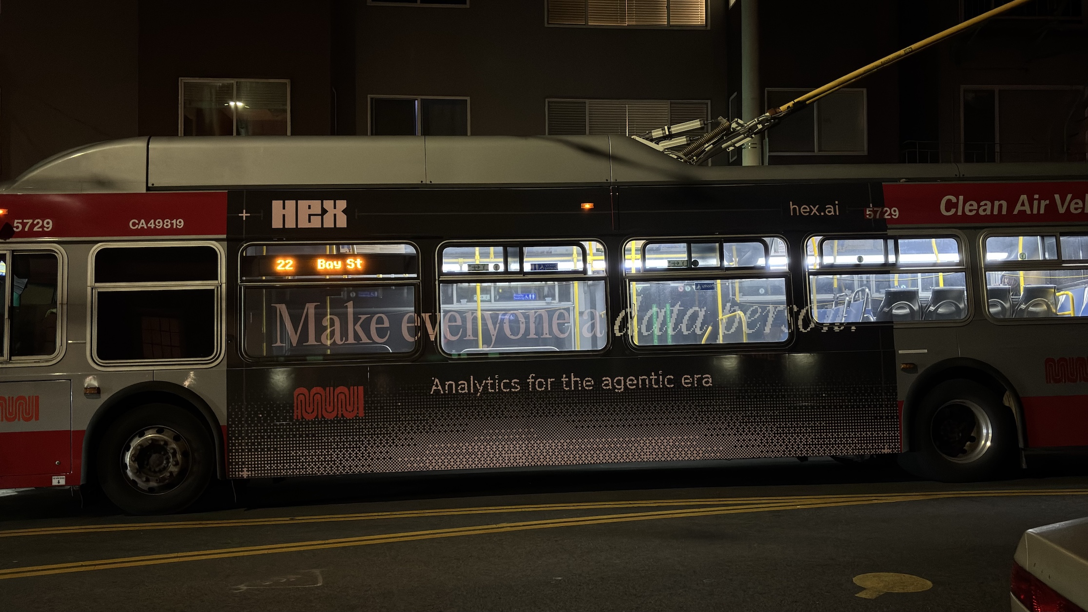 [ SF Muni buses these days are mobile tech adverts, clad as they are in the wraparound garments of AI propaganda... ]