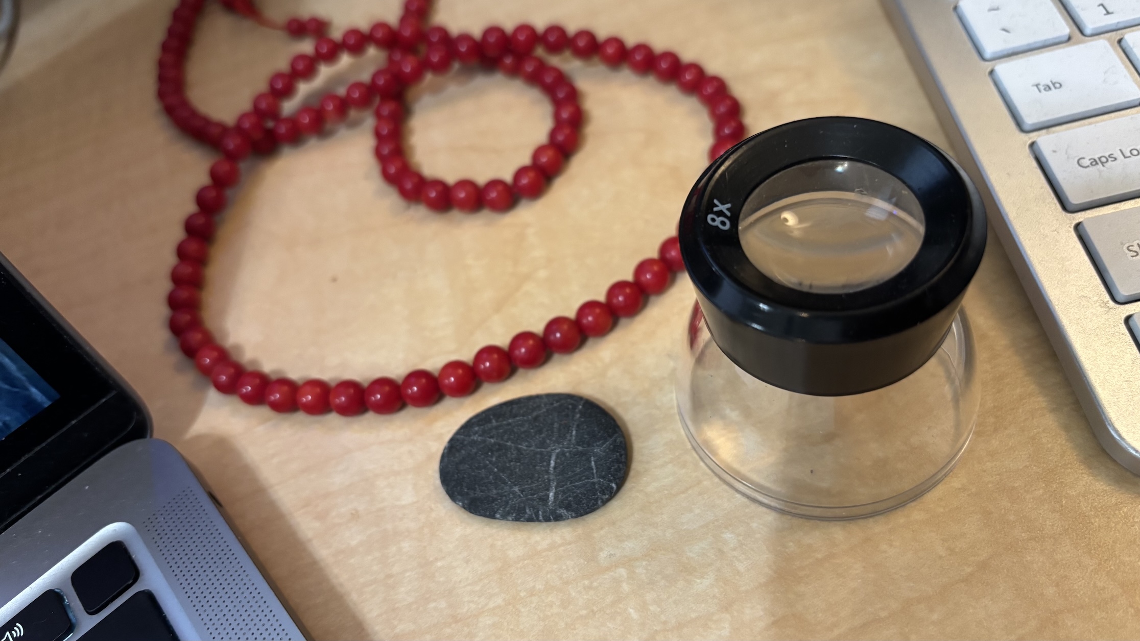 On my desk are a flat, gray stone; a red-bead mala; a loupe. They've found my way to me via various paths... the stone I picked up one time at Crissy Field beach, near the Golden Gate Bridge; the mala, given to me by Sonam Tsering, whose apartment I sublet for 3 months when he was away visiting his family in Nepal; the loupe, a gift to me from Jon Sullivan of Berkeley, CA.