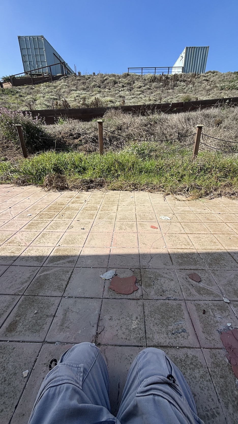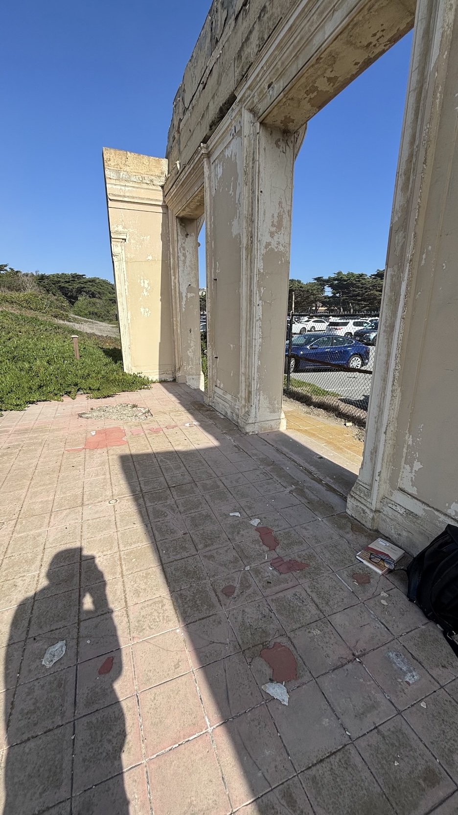 Started snapping pics with my phone, when a couple of security guys on bicycles on the Zoo Parking side rode up and said I was in a private area and had to leave; they asked me how I got in there, and I told them about the dune buildup on the other side, and was just here to take photos of the arch ruins. They said I could do so, and then leave, after which they rode off. Of course I did the first part, and then sat by the sea-facing side of the arch, my back to the Parking lot. From that vantage point I was invisible to any observer, and so peacefully sat a while, the scree and calls of segulls and ravens mixing with the sound of the surf across the highway.