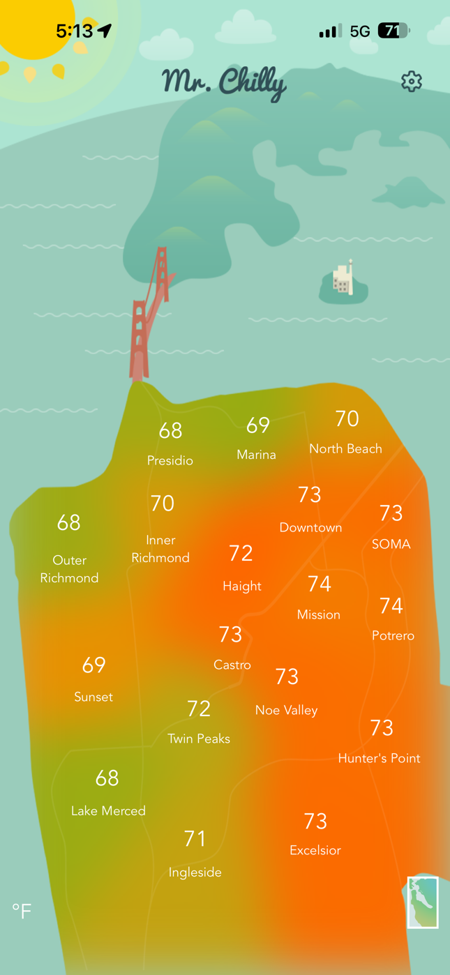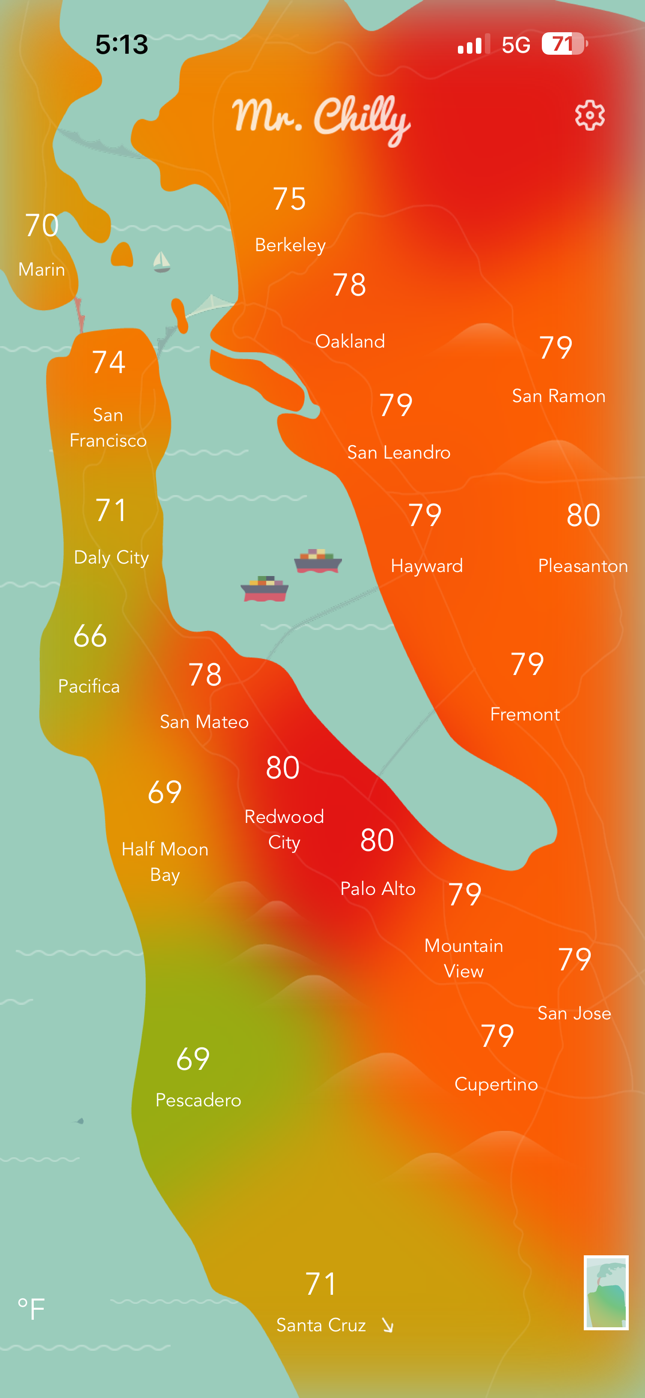 These 2 Mr. Chilly screenshots (below) are as of a little past 5 and it has cooled down a bit, but one can tell from the red blushes all over the East and South Bay how today was. Supposedly some rain in the offing, by the week's end, but we'll see.