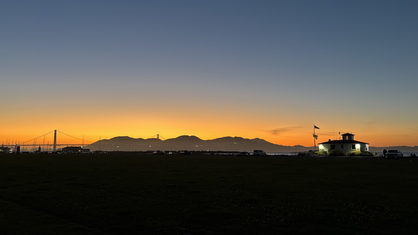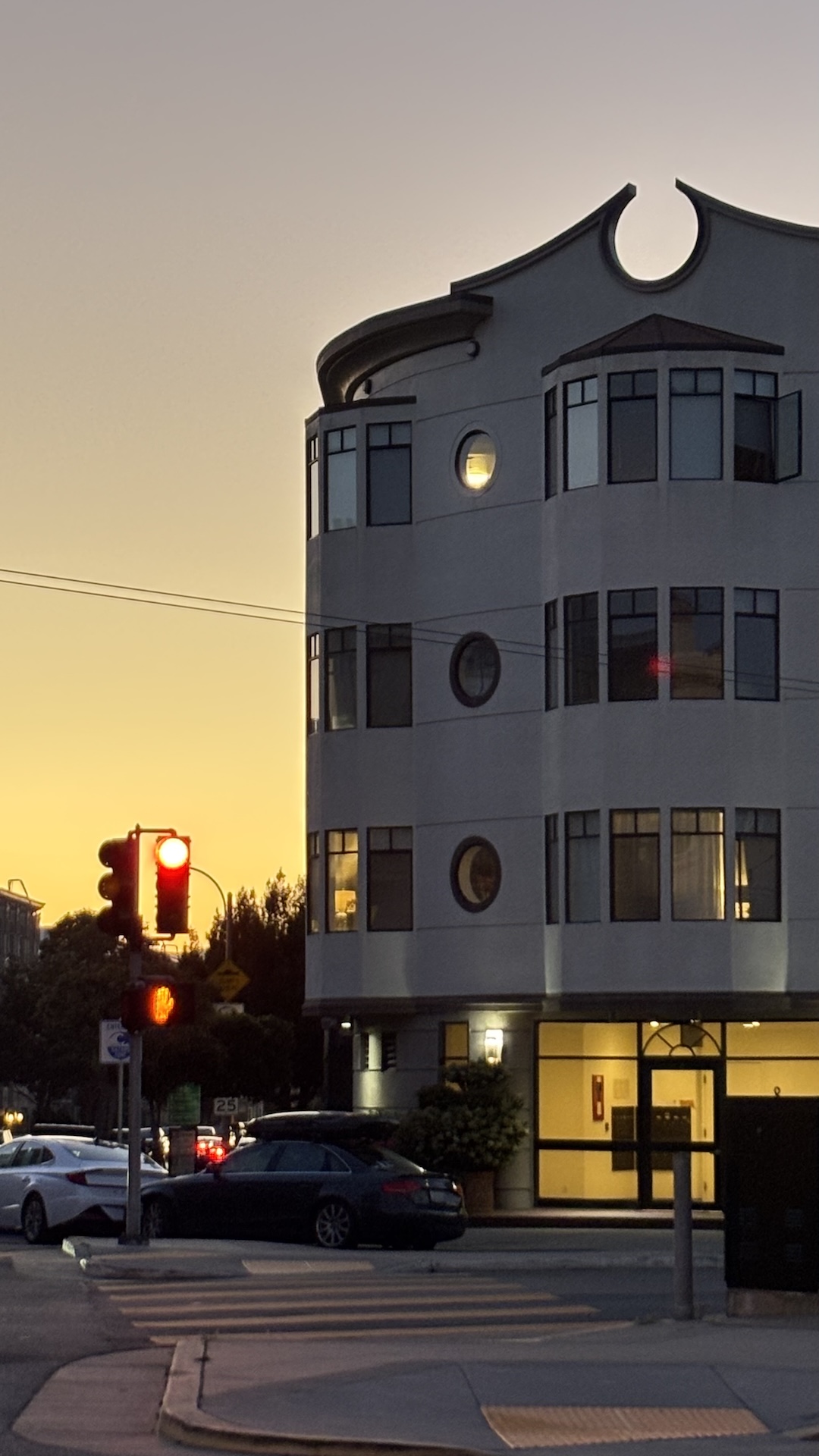 I’m guessing you were enchanted by that interplay of geometric curves—the crescent‐topped cornice, porthole windows, and glowing round light—set against the cool twilight and punctuated by the red traffic signal.