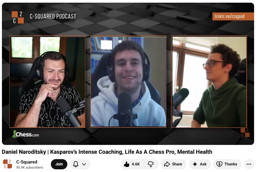 The hosts are both GMs, with of course Caruana being one of the very top chess players in the whole world at present (and arguably top 10 of all time in my book); and this chess podcast has always been a fave of mine for some time now. Chirila is a very thoughtful and engaging interviewer, and Fabi is just sheer layered brilliancies [chess pun ::chuckle:: and also punning here a tribute to Danya] on chess history and analysis, as well as uncommon insight into chess and human psychology.