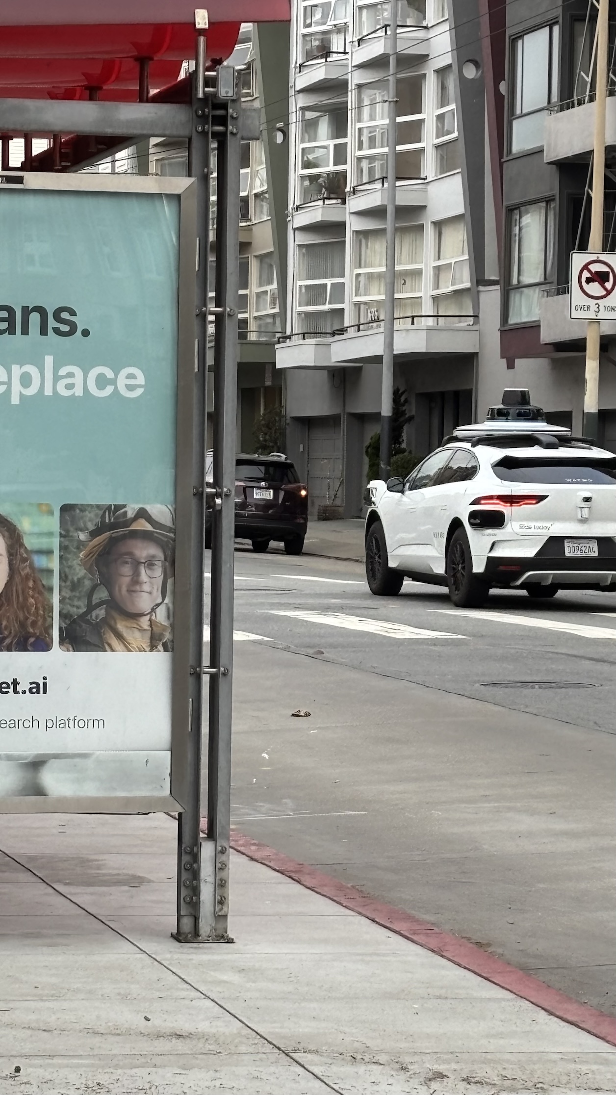 [ Hover on above ¶s for the original in English - translation into Deutsch rendered to me by Claude; below, the irony of Waymi passing by this MUNI bus stop signage... ]