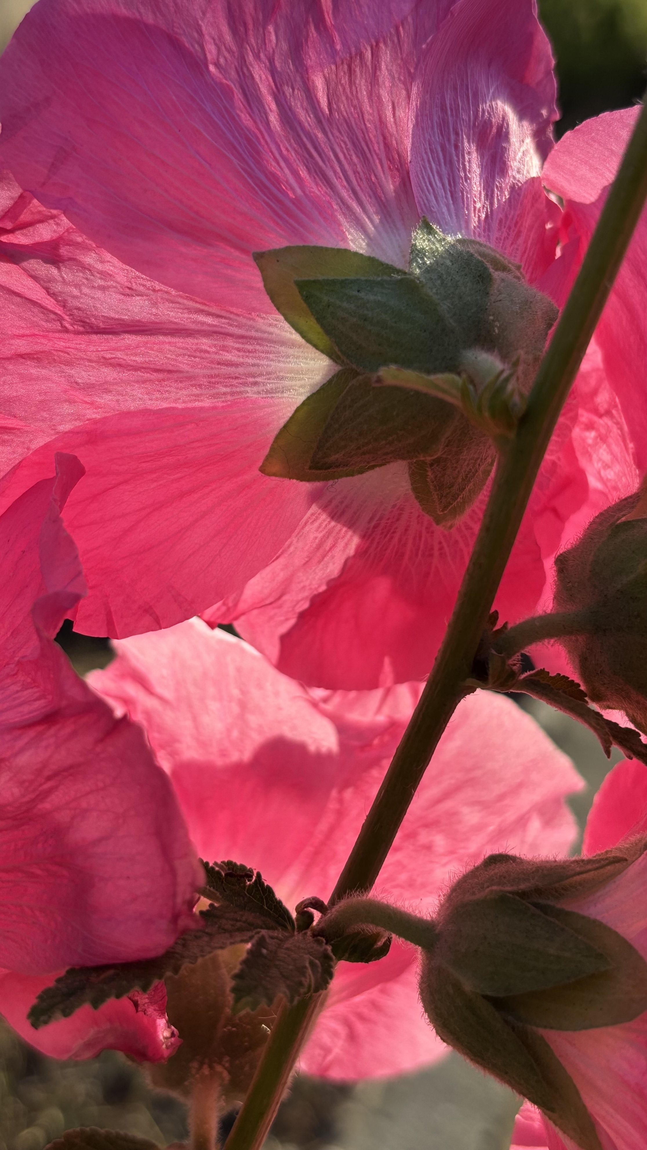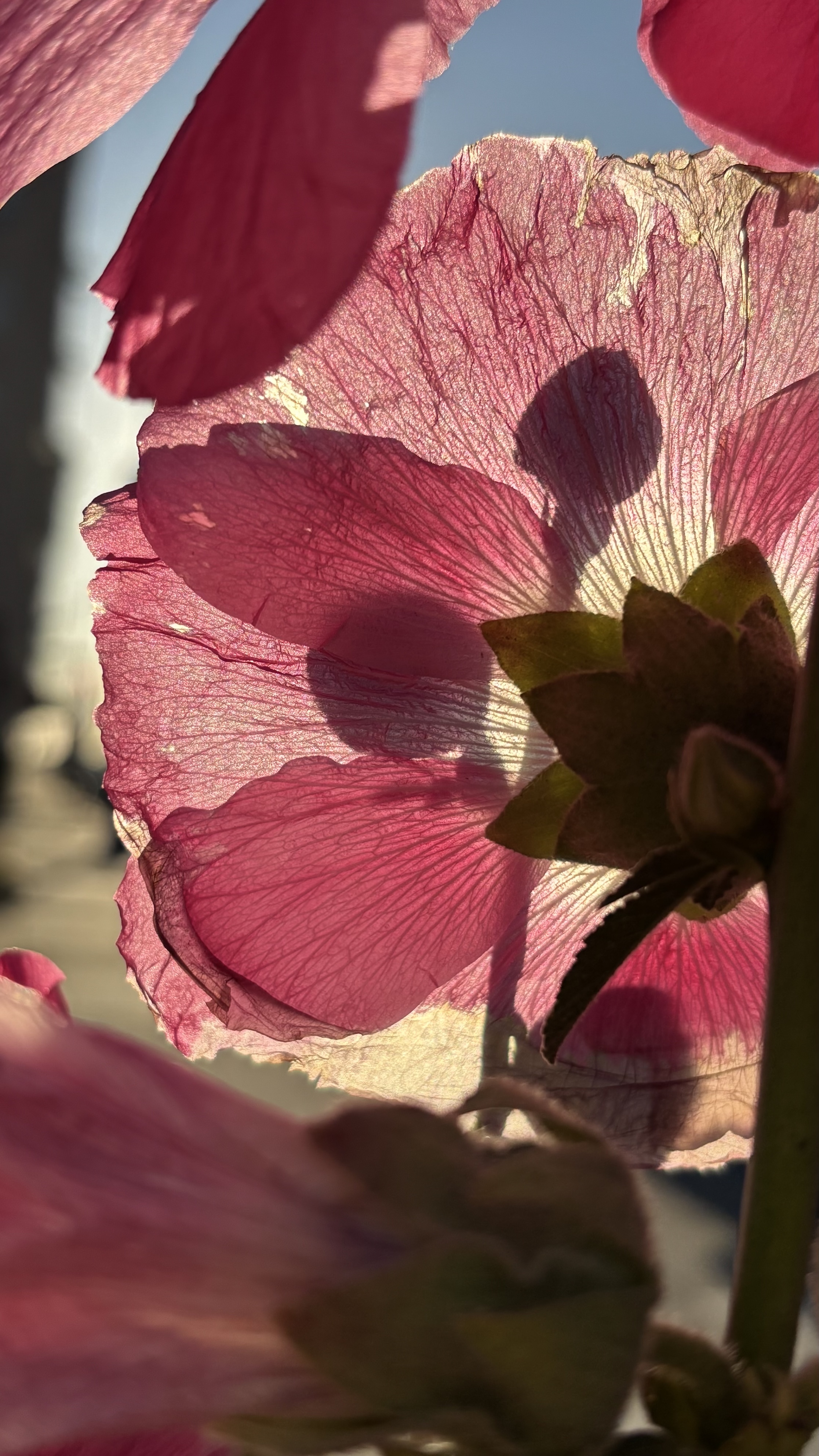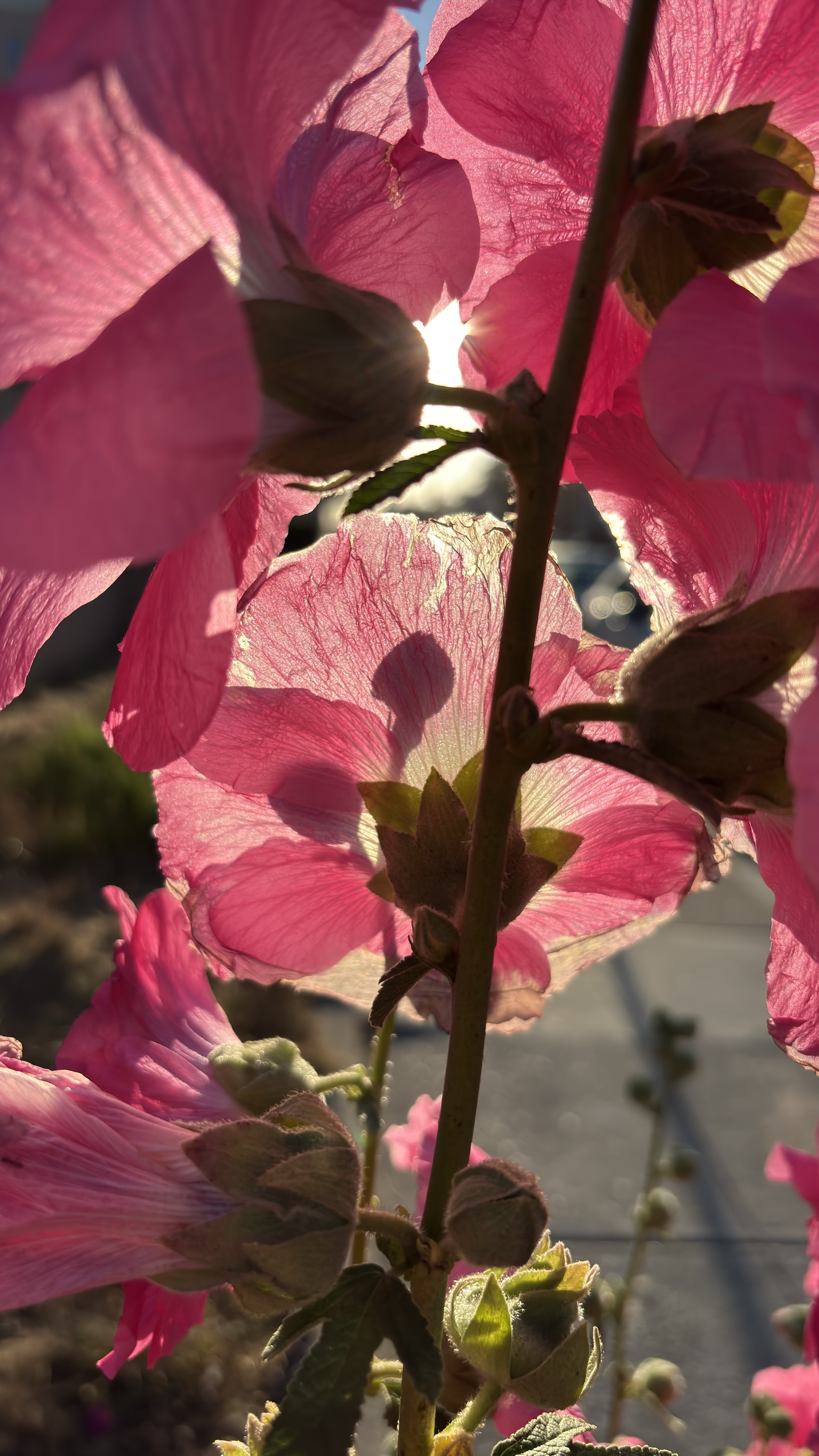 So imagine my baffled surprise when, late this summer the creature started blooming. At first, its blossoms (which reminded me of a kind of misshapen, imitated, hibiscus) looked pale and wan, its countenance a sickly washed-out pink in the broad daylight, barely deserving one's pity-laced glance. So, walking past it that one morning's sunrise in the direction down Bay towards the east, I happened to stoop and look through the bloomy growth, my eye having been caught by the angular rays of sunshine streaming down from the general direction of My. Diablo in the far and imagined distance.