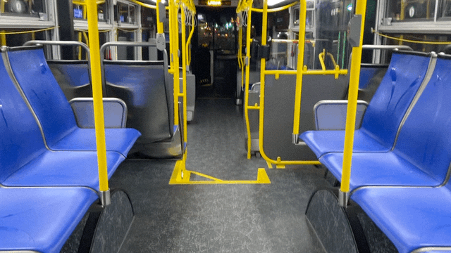 [ Looping GIF of an empty MUNI bus, taken from the back-most seats, obvi; time indeterminate, even as it looks dark outside (could be dusk, could be dawn)... ]