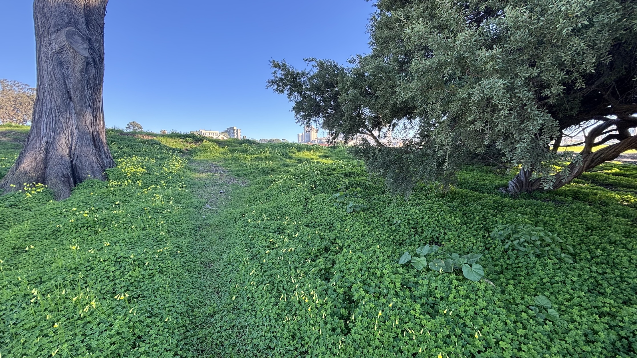 It occurs to me that this would be a good spot for zazen; the challenge being to integrate the sound of vehicular traffic nearby at the always-busy intersection and entrance to the Fort Mason Center for Arts & Culture; as well as the sounds of bicyclists and runners mere steps away along the main paths, and the walkers who, like me, choose the 'desire path' through the tea trees just above the old train tunnel exit, now closed for good.
